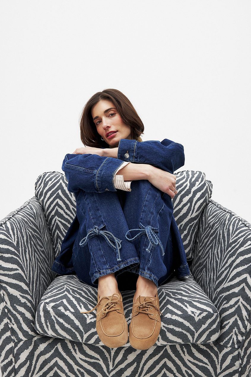 The cut is shaped to flatter the natural curve without clinging—sculpted through the hip with room through the thigh for comfortable movement. The leg can be straight, tapered or slightly flared depending on the SKU; each option is balanced so the tie-front remains the focal detail without overwhelming the silhouette.